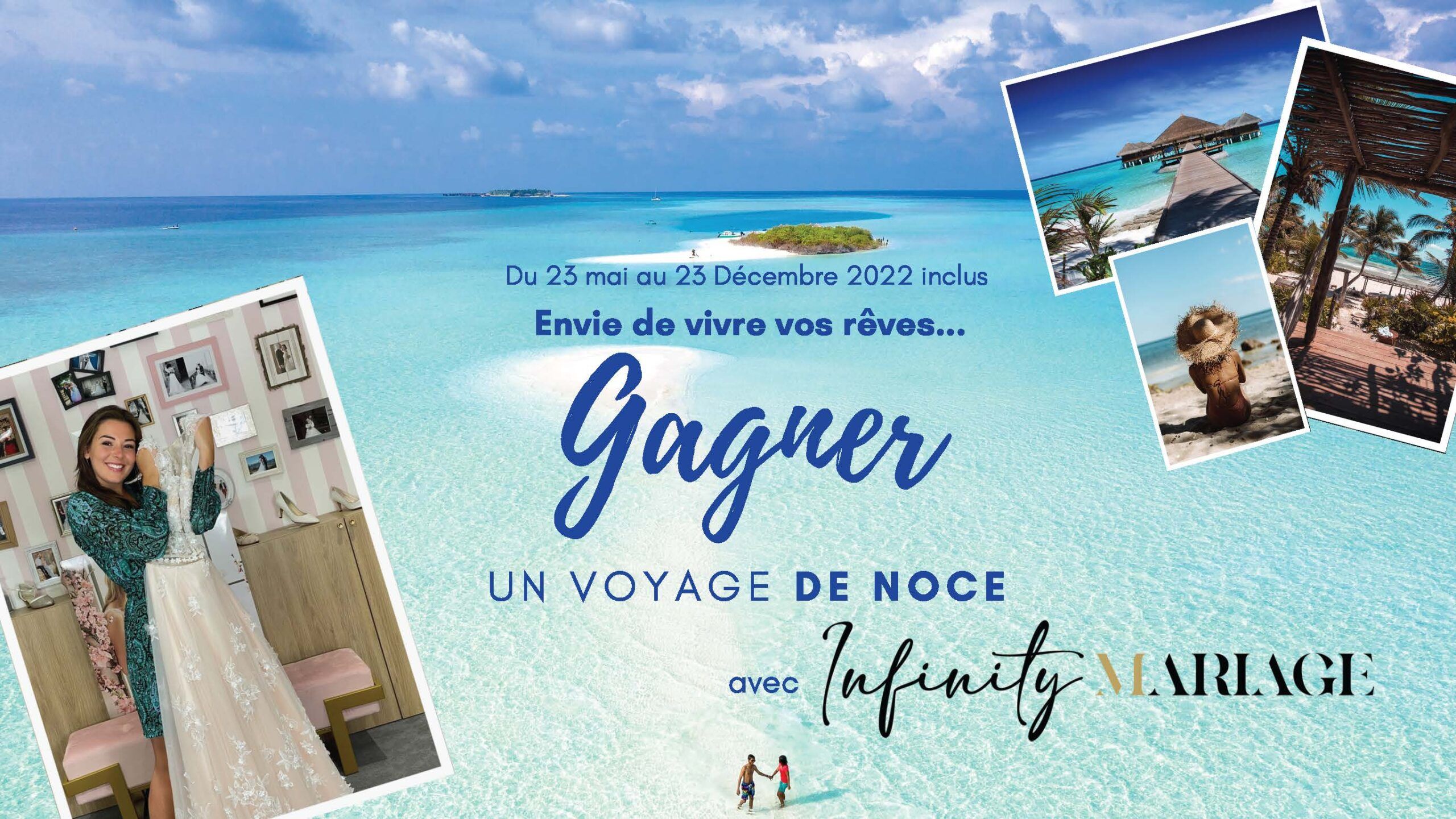 Du 23 mai au 23 décembre 2022, Vivez vos rêves et gagnez votre voyage de noce, Validez une commande avant le 23/12/2022 portant sur l’achat d’une robe de mariée d’une valeur supérieure à 500€TTC pour une célébration en 2023, et remplissez un bulletin participatif remis dans l’une de nos boutiques Infinity MARIAGE pour être enregistré(e) au tirage au sort planifié le 23/12/2022.